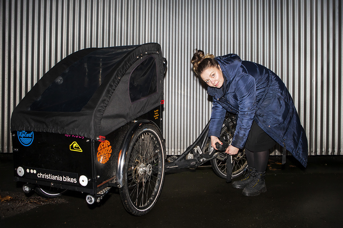 Louise Mejlholm låser nu cyklen med tre låse. (Foto: Mette Frandsen).