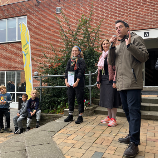 Sarah Phillips Hansen med prisen flankeret af elever fra skolen.
