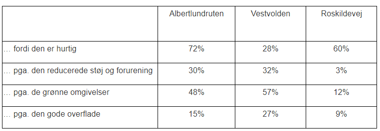 Som det fremgår af tabel 1 vælger mange som forventet Albertslundruten, fordi den er hurtig. Dette viser rutens rolle som pendler- og transportrute i sammenligning med Vestvolden, hvor kun 28 % angiver det samme.