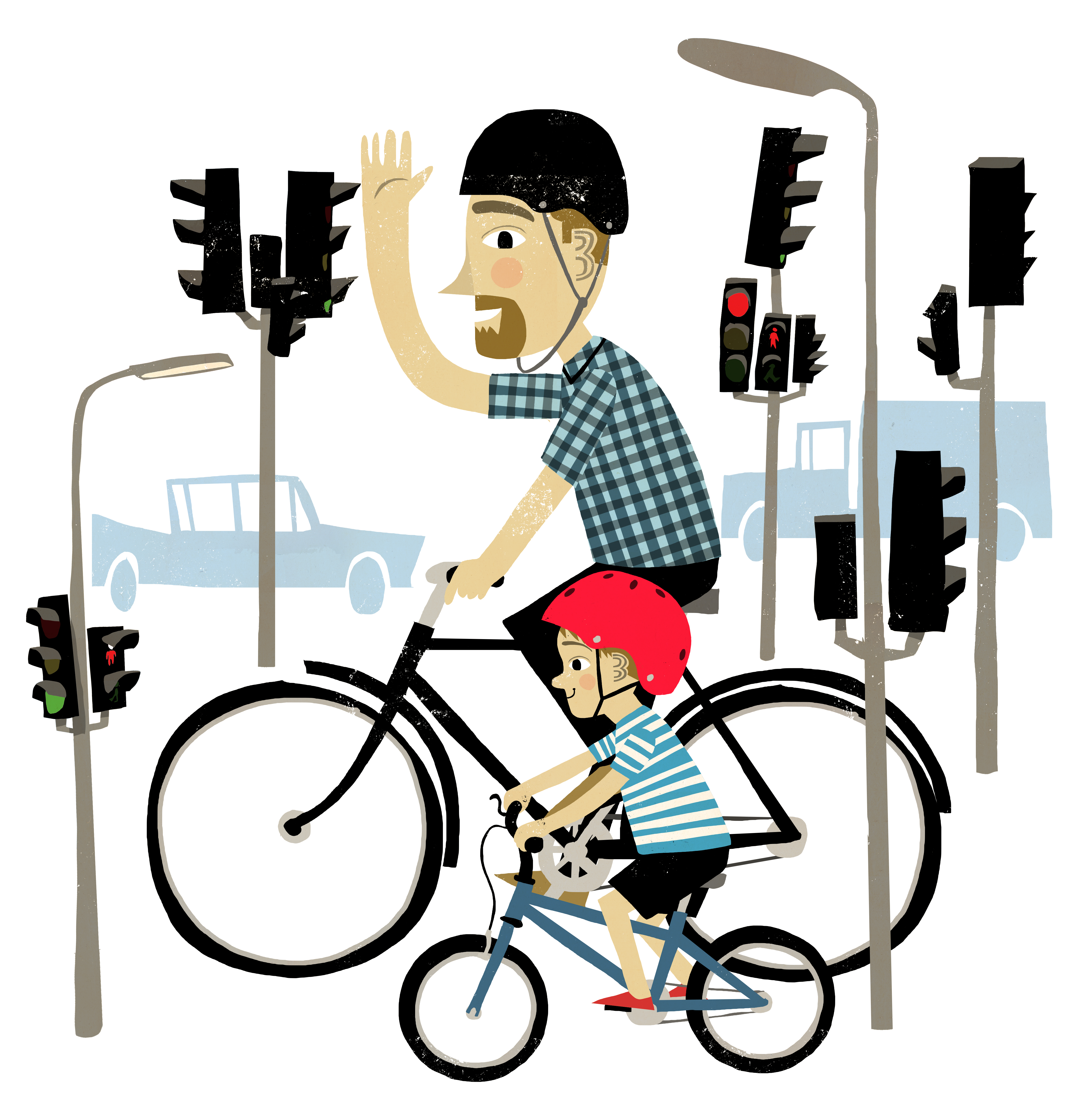 Når I cykler, skal barnet cykle inderst på din højre side. Sørg for, at du kan se barnet hele tiden. Vær bevidst om at sige til i god tid, når I skal stoppe eller dreje. Og stå af og træk cyklerne, når I skal over en vej. Det tager mange år at lære at cykle sikkert i trafikken. Så træn, træn, træn, for øvelse gør mester!