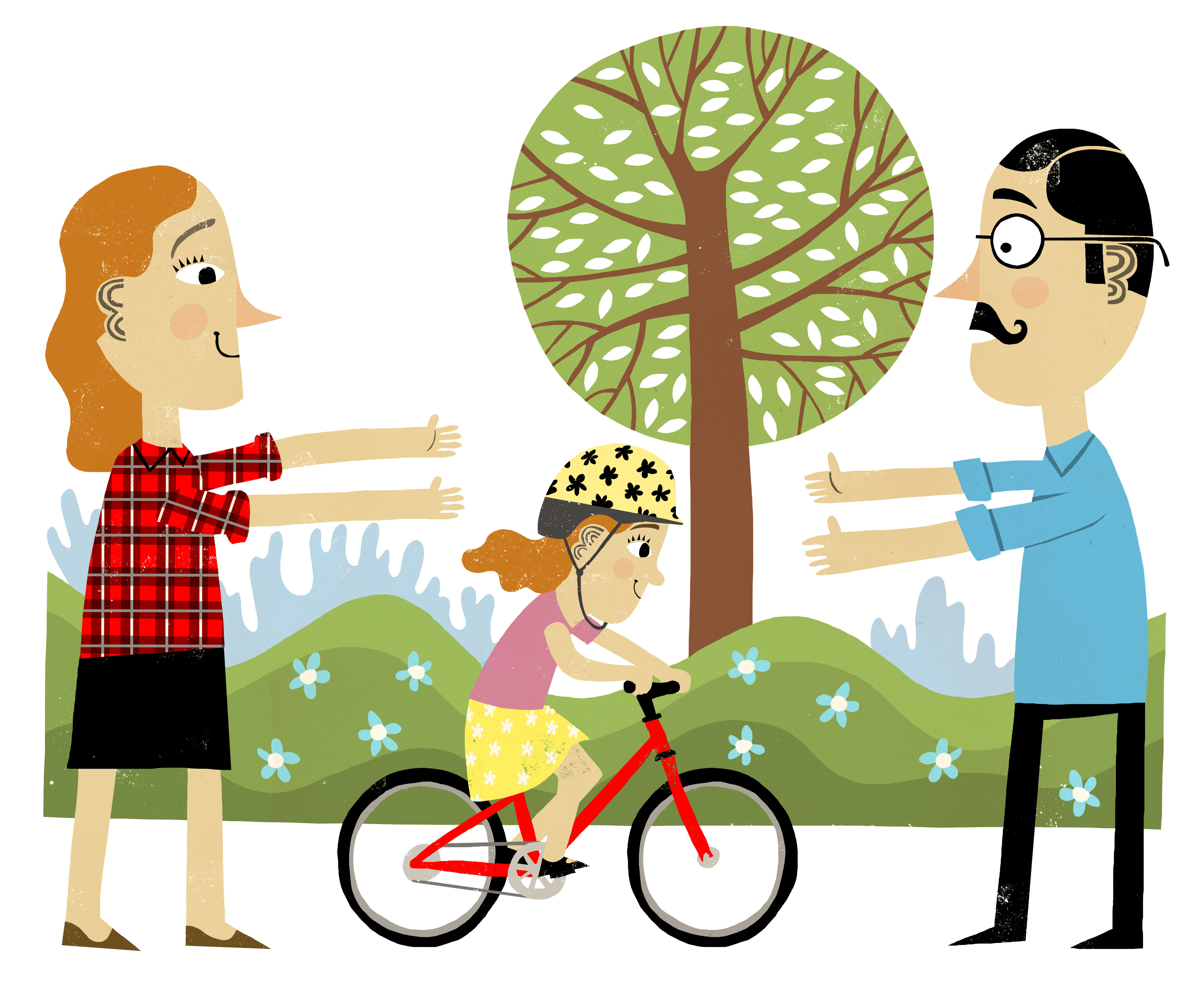 Cykelhjelmen er et must. Men drop knæbeskyttere og albuebeskyttere, de hæmmer bare barnets bevægelser. Skrammer på knæene er okay. Det er svært at lære at cykle uden at slå sig – for når barnet vælter, lærer det yderpunkterne af balancen at kende. Stå klar med kram og trøst og måske et plaster. Så er barnet snart oppe på cyklen igen.