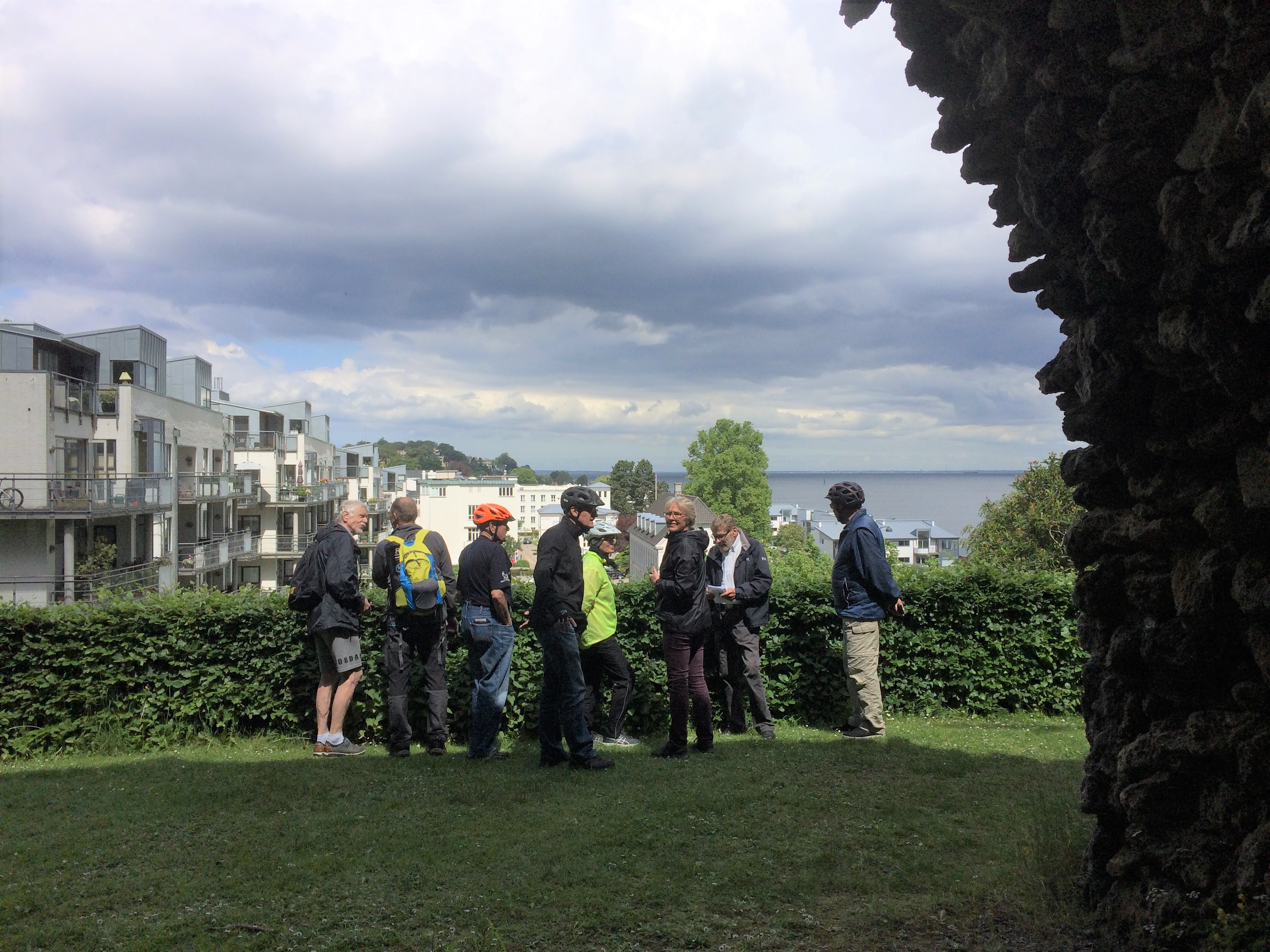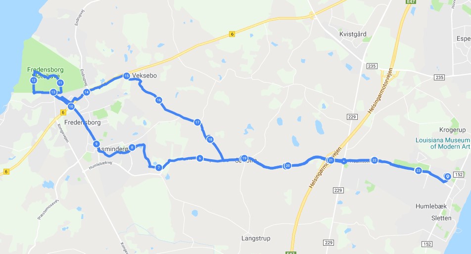 Turen udgik fra Humlebæk station, og derfra kørte vi over Søholm direkte til Fredensborg. Undervejs standsede vi op et par steder, hvor vores guide, Bent Skov Larsen fra Fredensborg – Humlebæk lokalhistoriske forening, fortalt om stedets historie. Ved Fredensborg slot stillede vi cyklerne og spadserede en tur i Slotshaven, hvor vi hørte om slottet, slotshaven og den tilknyttede by’s historie.