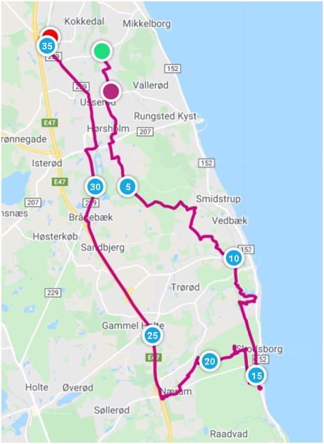 Herunder et kort der viser turen fra Kokkedal Station og indtil vi fandt "Grisestien" efter en kørsel på ca. 19. km.