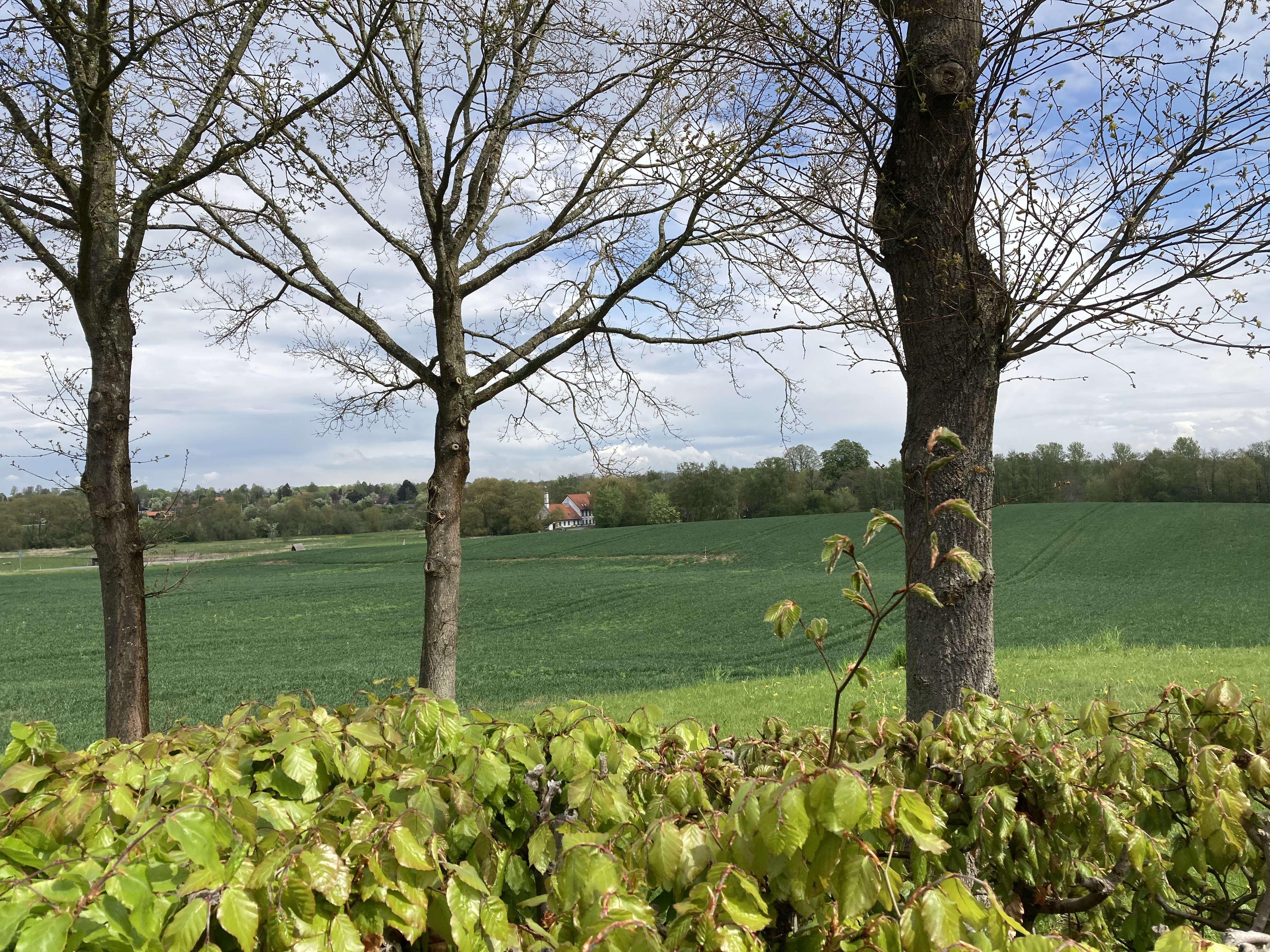 Udsigten fra parkeringspladsen ved Nivå Kirke mod Nive Mølle